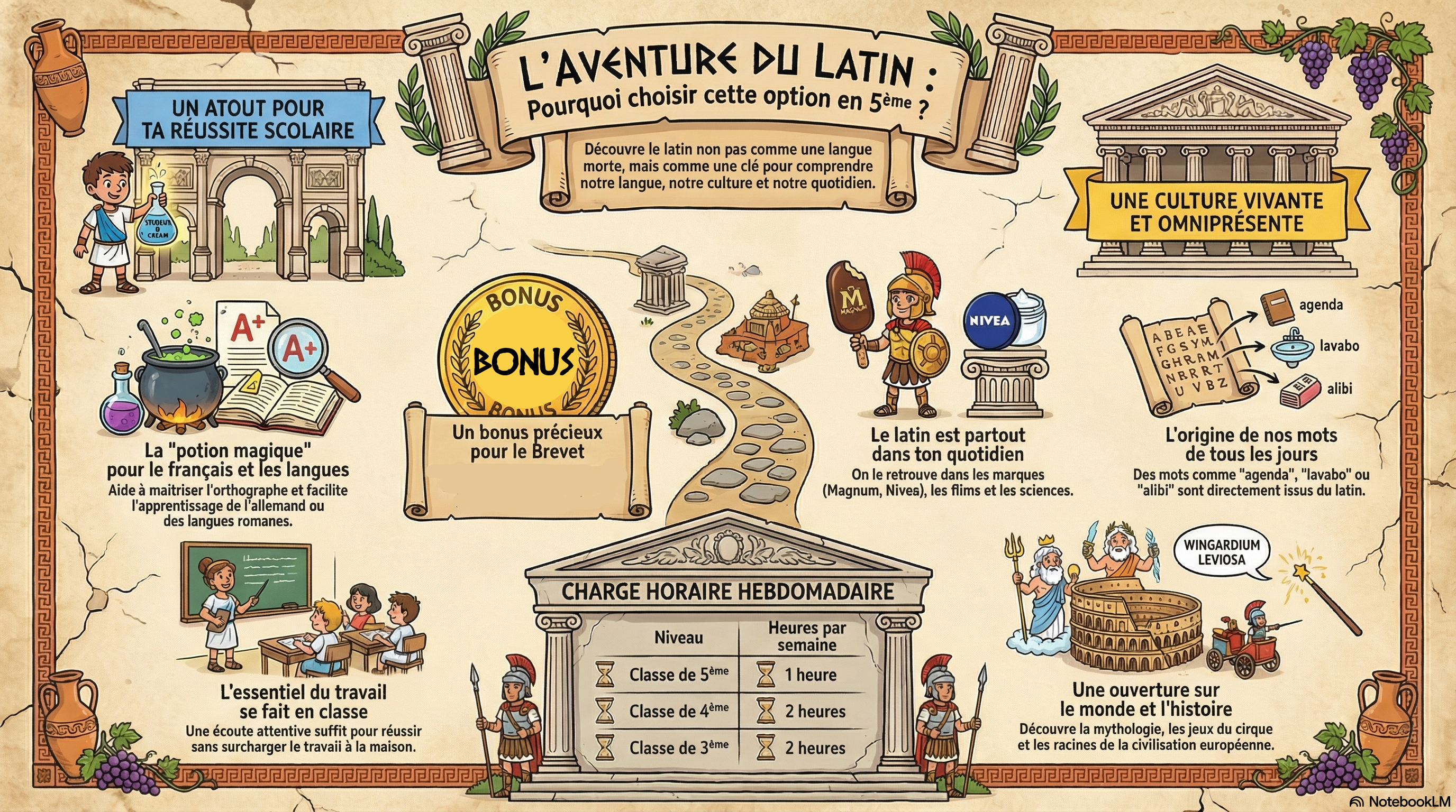 A l’approche de la fin de l’année scolaire, il vous est demandé, à vous et à votre enfant, de vous prononcer pour le choix de l’option latin à partir de la 5e jusqu’en 3e. Cette option est ouverte à tous les élèves de 6e qui en feraient la demande. Le professeur de latin présente, du 30 mars au 3 avril 2026, cet enseignement aux élèves de 6e.