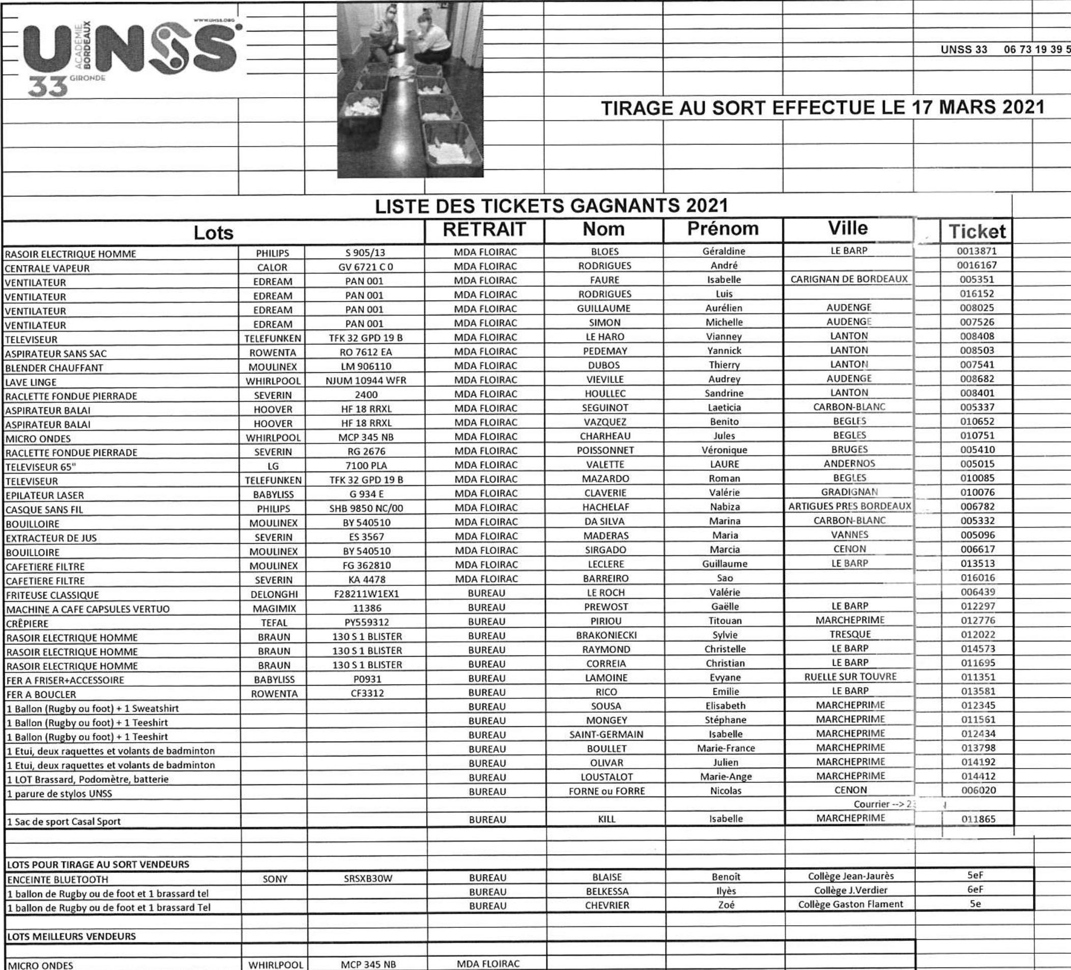 Résultats tirage tombola UNSS 2021