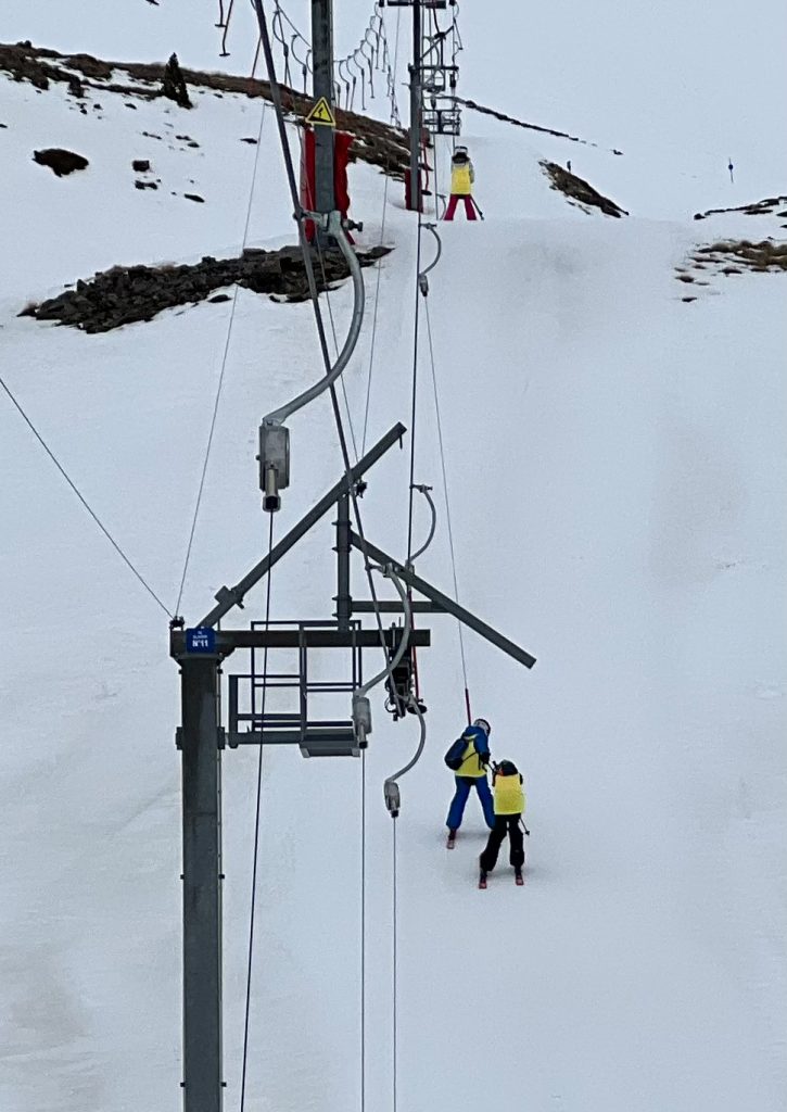 Une avant dernière journée au temps mitigé et variable. La pluie de la nuit a laissé les pistes dans un triste état. Les pistes gelées ont entrainé une surabondance de chutes dans le groupe. Nous sommes retournés sur le domaine d’Espiaude avec les élèves les plus rapides afin qu’ils puissent faire quelques pistes noires et certains élèves ont pris le téléski de manière peu conventionnelle…
